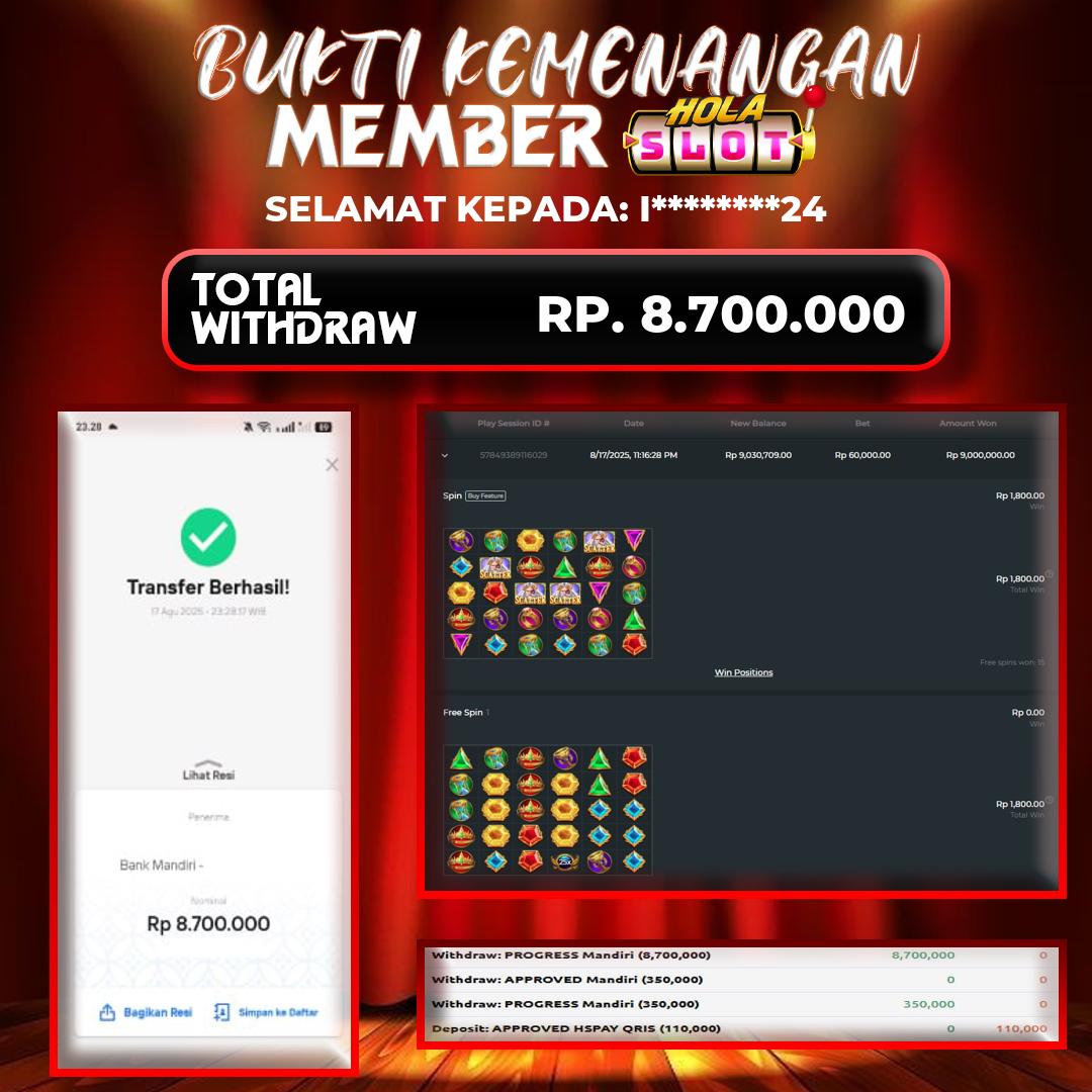 Selama bermain di HOLASLOT, banyak pemain telah meraih kemenangan besar yang dibagikan melalui halaman testimoni kami. Oleh karena itu, testimoni ini menjadi bukti nyata bahwa peluang menang sangat terbuka bagi siapa saja. Selanjutnya, dengan banyaknya promo menarik yang tersedia setiap hari, para pemain memiliki kesempatan lebih besar untuk meraih hasil maksimal. Sementara itu, berbagai bonus seperti cashback, free spin, dan turnamen berhadiah terus diluncurkan untuk menambah keseruan. Sebagai kesimpulan, HOLASLOT bukan hanya tempat bermain game online, tapi juga ladang keberuntungan yang layak Anda coba sekarang juga!.