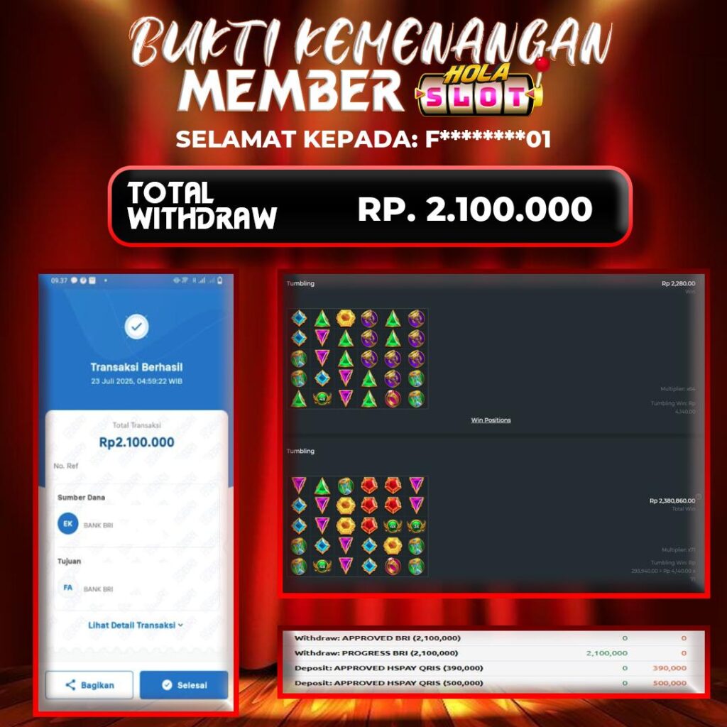 Selama bermain di HOLASLOT, banyak pemain telah meraih kemenangan besar yang dibagikan melalui halaman testimoni kami. Oleh karena itu, testimoni ini menjadi bukti nyata bahwa peluang menang sangat terbuka bagi siapa saja. Selanjutnya, dengan banyaknya promo menarik yang tersedia setiap hari, para pemain memiliki kesempatan lebih besar untuk meraih hasil maksimal. Sementara itu, berbagai bonus seperti cashback, free spin, dan turnamen berhadiah terus diluncurkan untuk menambah keseruan. Sebagai kesimpulan, HOLASLOT bukan hanya tempat bermain game online, tapi juga ladang keberuntungan yang layak Anda coba sekarang juga!.